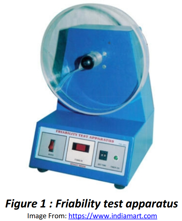 This is a property of solid insulation material which shows its tendency to break into smaller pieces under the tumbling, cyclic loads, rubbing, or expansion and contraction due to thermal strains. Material with high friability looses mass over the long service duration due to many cycles of dynamic thermal movements of hot surfaces and so insulation looses its effectiveness. Friability test most commonly used in the pharmaceutical industry to measure the Friability of tablets. Machine used for this test is shown in picture below.