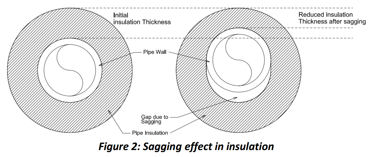 Figure below shows sagging of insulation material around pipe section. Initially when insulation is newly installed there is uniform thickness of insulation all around the pipe but after certain long duration of service this thickness does not remain uniform around the pipe.