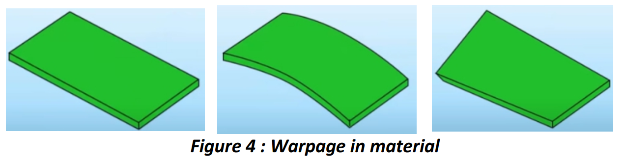It is a property of material that causes material shape to twist and distort and/or develop cracks on the surface due to heat exposure. Warpage is different from the shrinkage. In shrinkage the dimensions of the material change and the volume of the material reduces. Where as in warpage the overall volume of the specimen remains same but its shape gets distorted. Figures below explains warpage in rectangle block. First figure shows normal specimen but remaining two figures shows warped specimen.